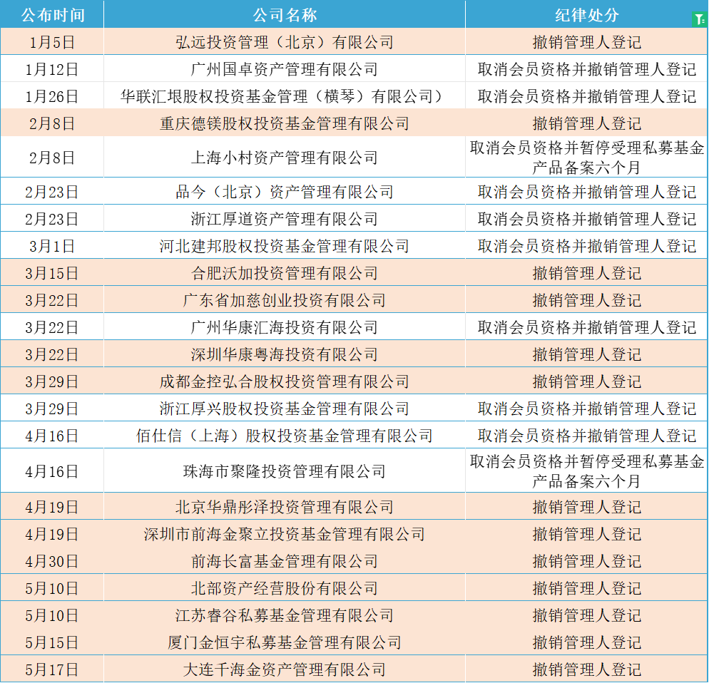 23家私募被罰撤銷管理人登記,其中有2家私募被罰取消會(huì)員資格并暫停受理私募基金產(chǎn)品備案六個(gè)月,8家私募被罰取消會(huì)員資格并撤銷管理人登記,13家被罰撤銷管理人登記。