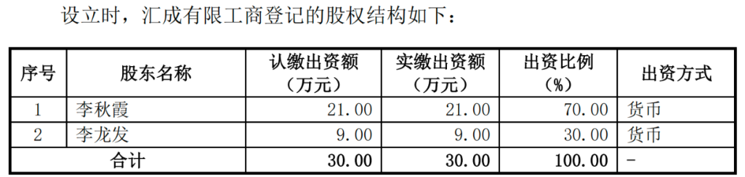 2006年7月28日,李秋霞和李龍發(fā)共同成立了匯成真空前身匯成有限,注冊資本為30萬元,其中李秋霞出資21萬元,占注冊資本的70%,李龍發(fā)出資9萬元,占注冊資本的30%。