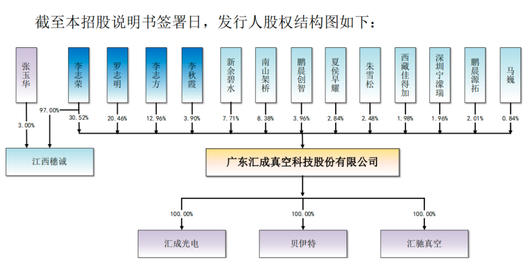 截至招股書簽署之日,匯成真空的實際控制人為李志榮、羅志明、李志方、李秋霞。李志榮、羅志明分別直接持有公司30.52%、20.46%的股份,李志方、李秋霞直接及間接持有公司13.63%、7.51%的股份,四人為同胞兄弟姐妹。