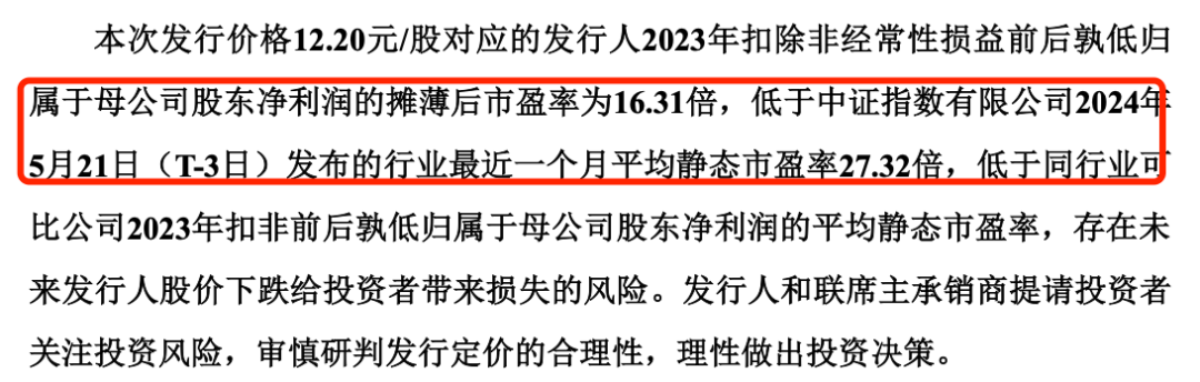 上市發(fā)行公告顯示,本次發(fā)行價格為12.20元/股,對應(yīng)市盈率為16.31倍,低于中證指數(shù)有限公司2024年5月21日(T-3日)發(fā)布的行業(yè)最近一個月平均靜態(tài)市盈率27.32倍。