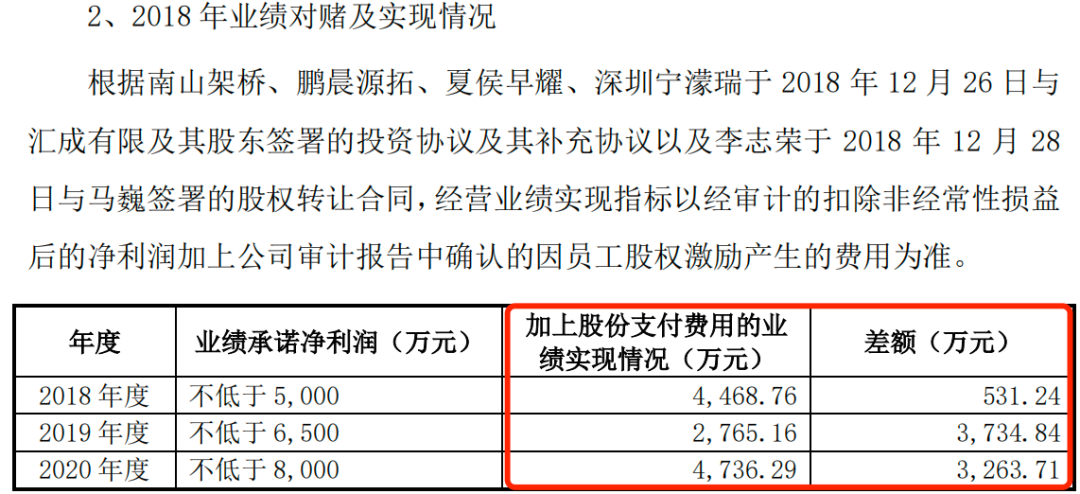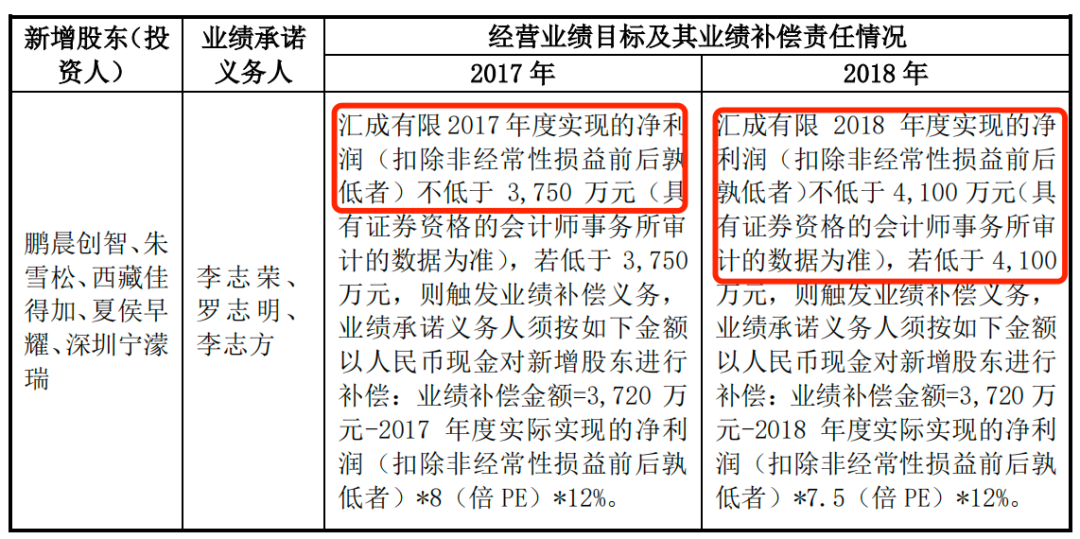 此外,李志榮與馬巍簽署股權(quán)轉(zhuǎn)讓合同,李志榮以500萬元的價格將其持有的匯成有限0.75%股權(quán)轉(zhuǎn)讓給馬巍,轉(zhuǎn)讓價格為108.37元/注冊資本。同樣對公司2018年-2020年的經(jīng)營業(yè)績目標(biāo)及業(yè)績補償責(zé)任做了約定。