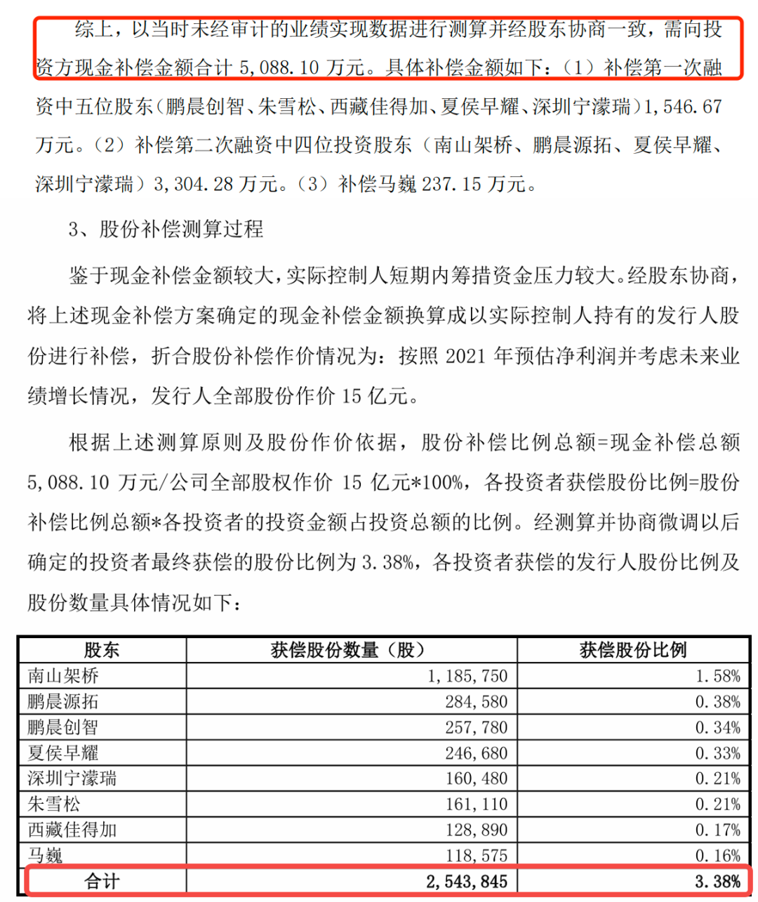 鑒于現(xiàn)金補償金額較大,實際控制人短期內(nèi)籌措資金壓力較大,后經(jīng)股東協(xié)商,將上述現(xiàn)金補償方案確定的補償金額,換算成以實際控制人持有的發(fā)行人股份進(jìn)行補償,投資者獲償股份數(shù)量總計2543845股,獲償股份比例為3.38%。