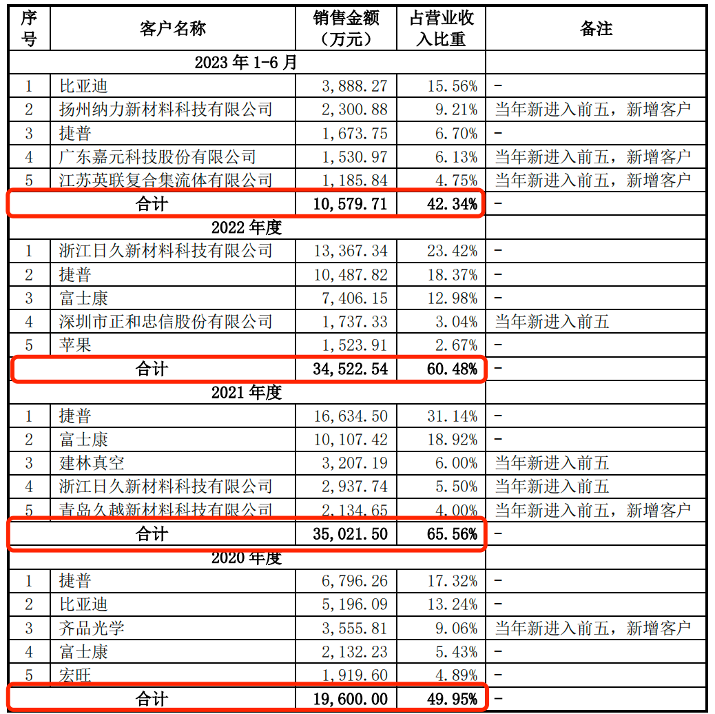 招股書顯示,2020年-2023年上半年(以下簡稱“報告期”),公司前五名客戶合計實現(xiàn)收入分別為1.96億元、3.50億元、3.45億元和1.06億元,占當(dāng)期營業(yè)收入的比例分別為49.95%、65.56%、60.48%和42.34%,占比較高。