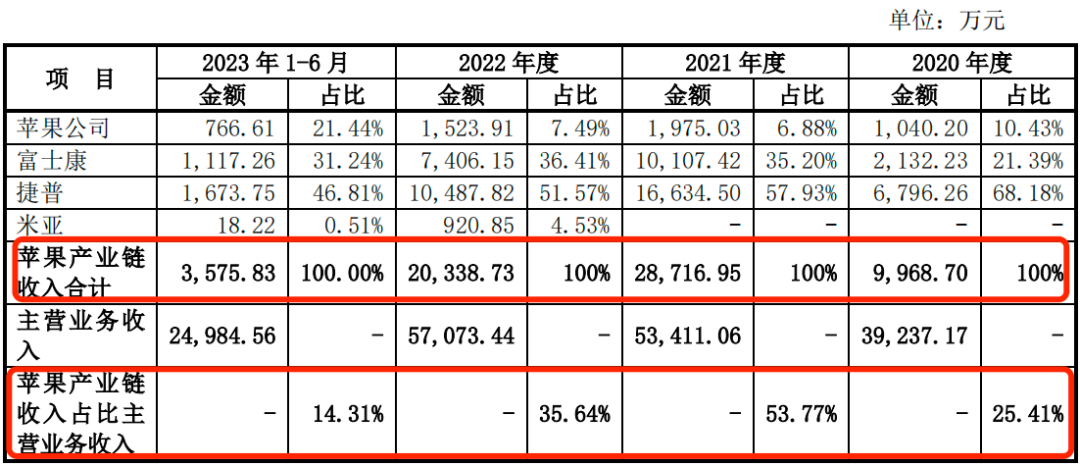 同期,來自蘋果產(chǎn)業(yè)鏈廠商的毛利占主營業(yè)務(wù)毛利額比例分別為36.74%、61.95%、49.74%和22.97%。