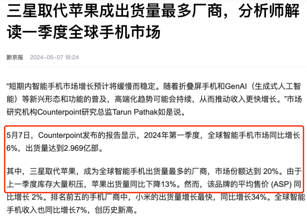 值得一提的是,5月7日,Counterpoint發(fā)布報告顯示,2024年第一季度,全球智能手機市場同比增長6%,出貨量達(dá)到2.969億部。其中,三星取代蘋果,成為全球智能手機出貨量最多的廠商,市場份額達(dá)到20%。由于上一季度庫存大量積壓,蘋果出貨量同比下降13%。