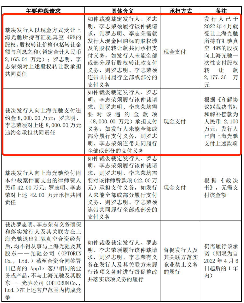上海光馳認(rèn)為匯成真空、實際控制人羅志明、李志榮違反了合資合同、收購協(xié)議的約定及觸發(fā)股權(quán)收購條件,于2022年3月對匯成真空及羅志明、李志榮向中國國際經(jīng)濟(jì)貿(mào)易仲裁委員會提起仲裁。