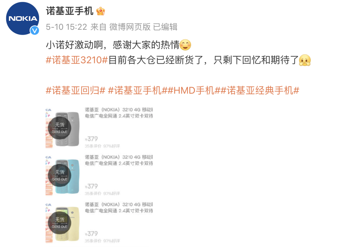 5 月 8 日,諾基亞通過(guò)官方微博宣布 1999 年推出的 3210 系列升級(jí)回歸。復(fù)刻后的 3210 升級(jí)了 type-c 充電口,支持雙卡雙待雙 4G 全網(wǎng)通,到手價(jià)僅 379 元。發(fā)布 2 天后,3210 便在各大倉(cāng)銷售一空。