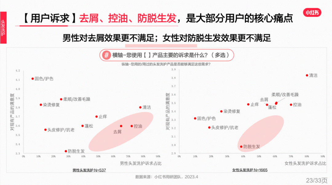 根據(jù)小紅書(shū)數(shù)據(jù),從洗護(hù)產(chǎn)品效果滿意度來(lái)看,消費(fèi)者對(duì)于防脫生發(fā)、頭皮修護(hù)/抗老、去屑、控油等滿意度普遍較低。若能夠針對(duì)于未滿足的需求推出功效性產(chǎn)品,則有望迅速占據(jù)更多市場(chǎng)。