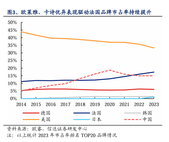 不過(guò),物極必反。依然占據(jù)最高市場(chǎng)份額的美國(guó)品牌,已顯露頹勢(shì),近10年來(lái),美國(guó)洗護(hù)品牌市占率整體呈下降趨勢(shì),已從2014年的近45%,下滑至2023年33.3%。