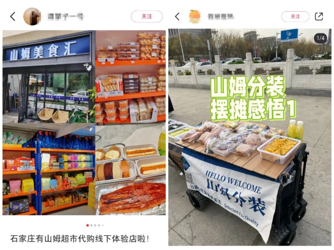 左:山姆代購(gòu)線下實(shí)體店 右:山姆分裝擺攤,圖源:小紅書(shū)