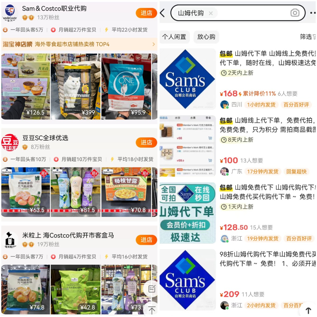 左:山姆代購(gòu)淘寶店;右:閑魚(yú)上的山姆代購(gòu),圖源:淘寶;閑魚(yú)
