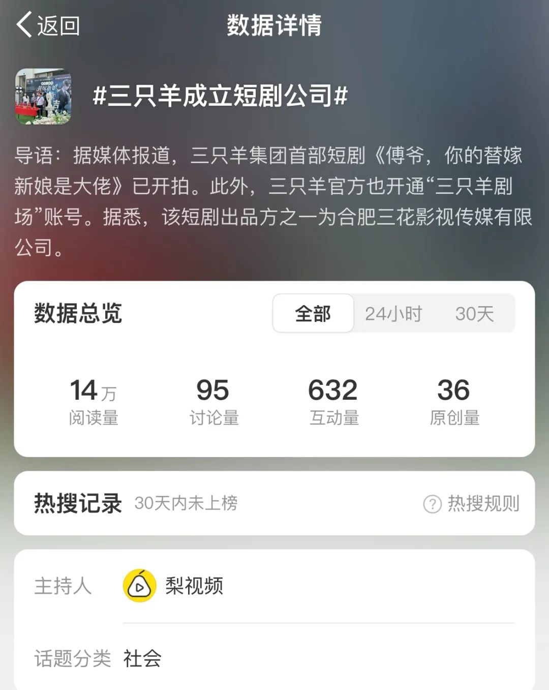 自從上線后,《替嫁新娘》短劇在抖音形成的9個微博熱搜話題里,開拍和撲街占據(jù)前列,也均未登上熱搜榜,可說在大眾端是口碑差,也不出圈。