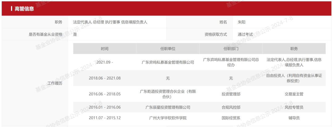 可能是每日持巨資在K線間穿梭,激發(fā)了朱陽(yáng)對(duì)證券交易的興趣。2018年6月,朱陽(yáng)再度離職,并開(kāi)啟了一段為期三年的自由投資人生涯。在中基協(xié)備案中,這段經(jīng)歷被標(biāo)注為“利用自有資金從事證券投資”。這之后,朱陽(yáng)才成立弈鳴基金。