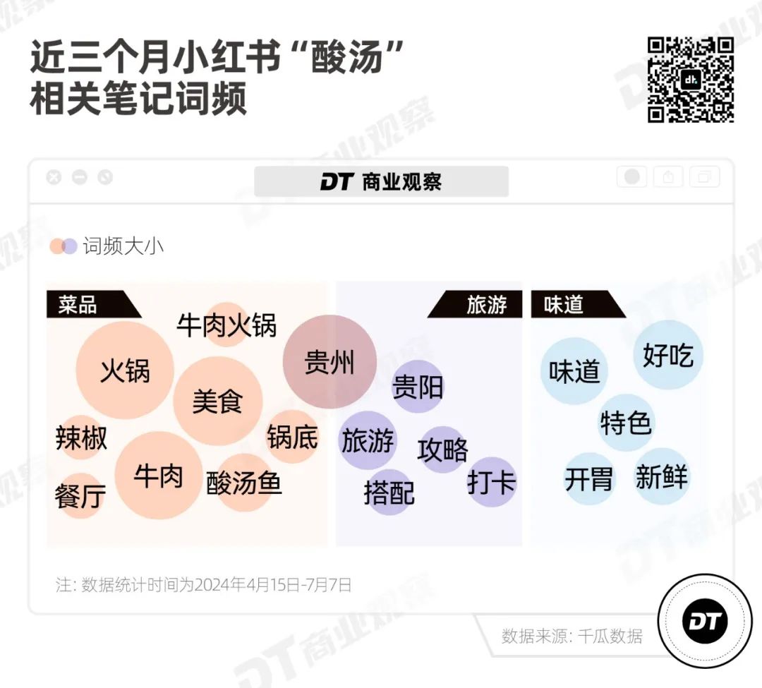小紅書和抖音上,一眾網(wǎng)友驚嘆于云貴酸湯的酸爽濃郁,“煮鞋底也能喝三大碗”,直接讓一線城市的打工人一秒瞬移貴州、云南。截至2024年7月5日,小紅書上酸湯相關(guān)的種草筆記超過70萬篇,抖音上有近100個酸湯相關(guān)話題,其中多個話題播放量破億。