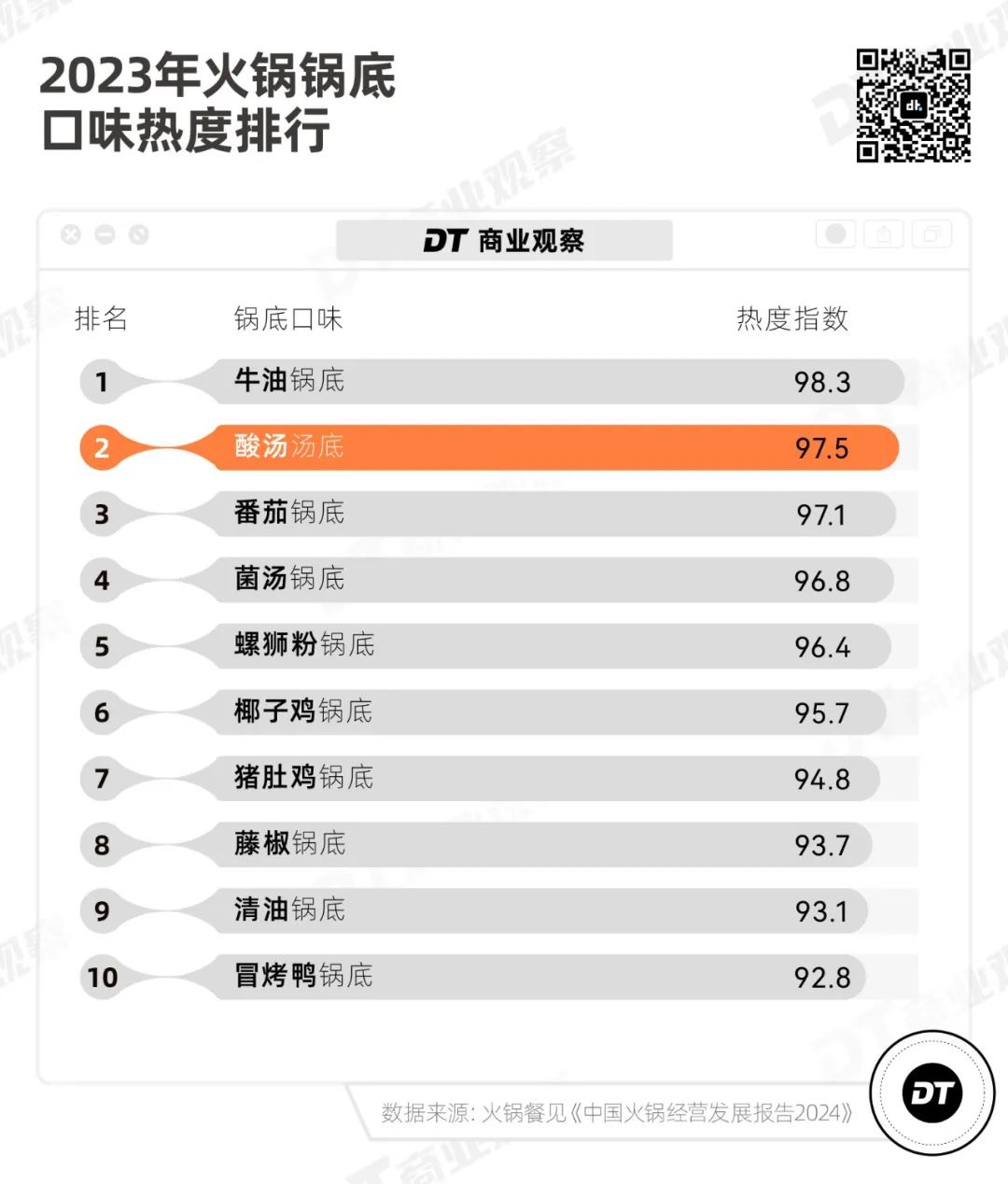 火鍋餐見發(fā)布的《2024中國火鍋經(jīng)營發(fā)展報告》,在去年火鍋鍋底口味熱度排行中,酸湯鍋底排名第二,比火鍋店常見的番茄鍋底還要高,僅次于牛油鍋底。