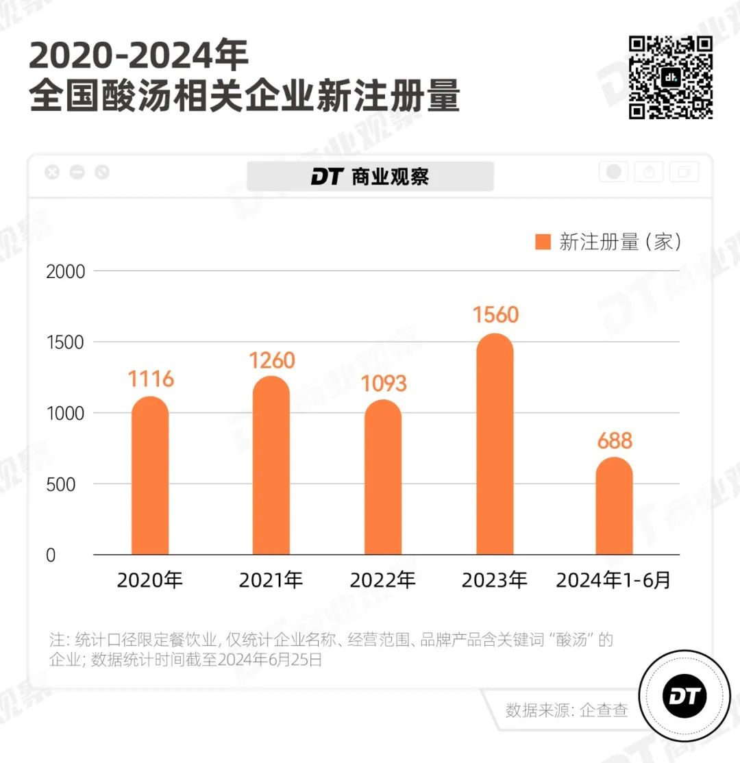 其實(shí)自2023年開始,餐飲市場上涌現(xiàn)了一批酸湯新品牌。根據(jù)企查查統(tǒng)計,2023年酸湯相關(guān)企業(yè)的新注冊量達(dá)到了1560家,相比過去三年的新注冊量都要多出超24%。