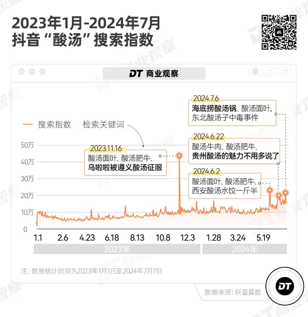 這股熱潮并未就此平息,今年6月至7月期間,除了酸湯肥牛、酸湯面葉這些此前就被熱議的話題,人們搜索的關(guān)鍵詞還新增了西安酸湯水餃、貴州酸湯和海底撈的雷山酸湯鍋新品。