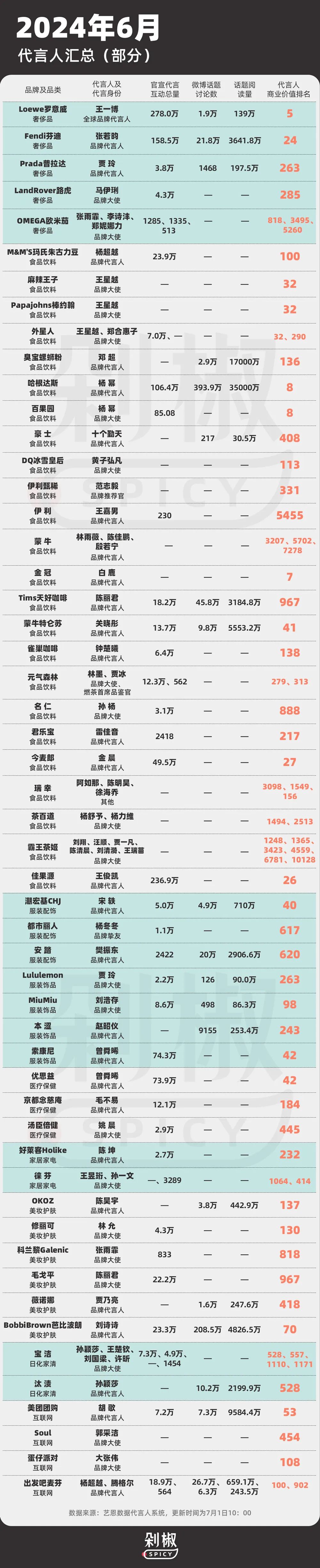 為此,剁椒Spicy開辟《代言人月度辣評(píng)》欄目,與藝恩等數(shù)據(jù)平臺(tái),以及蘭渡、贊意等領(lǐng)先的營銷機(jī)構(gòu)聯(lián)手,盤點(diǎn)代言動(dòng)向,提煉行業(yè)觀點(diǎn)。