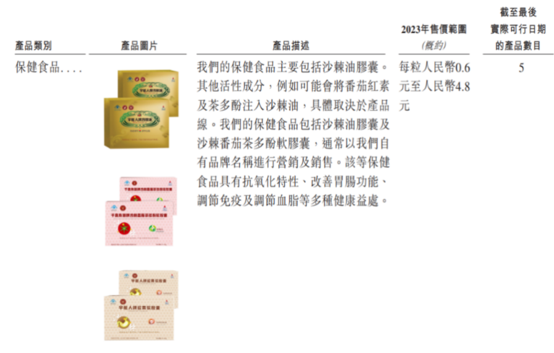 公司第二大收入來源則為保健食品,主要包括沙棘油膠囊及沙棘西紅柿茶多酚軟膠囊。公司介紹稱,這些保健食品不僅具有抗氧化特性,還能改善胃腸功能、調(diào)節(jié)免疫及調(diào)節(jié)血脂。報告期內(nèi),保健食品帶來的收入分別為0.34億元、0.38億元和0.6億元,占比從22.9%提升至27.3%。