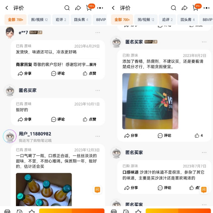 在淘寶宇航人官方旗艦店中,6瓶300ml “宇航人沙棘龍鮮榨果汁”售價49.9元,銷量達到2000+。消費者對該款沙棘汁的評價褒貶不一,有消費者認為其酸甜可口,性價比高。也有消費者指出該款產(chǎn)品不是原汁,添加了香精、防腐劑。