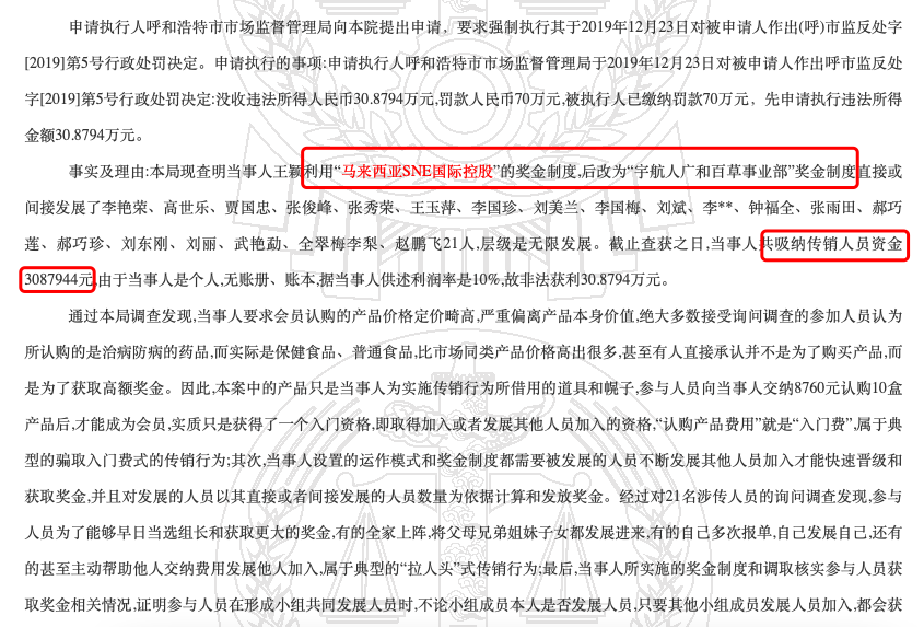 據(jù)“中國裁判文書網(wǎng)”內(nèi)容可知,2019年,王某通過“馬來西亞SNE國際控股”和“宇航人廣和百草事業(yè)部”的獎金制度,發(fā)展了21人參與傳銷活動,共吸納資金308.79萬元。