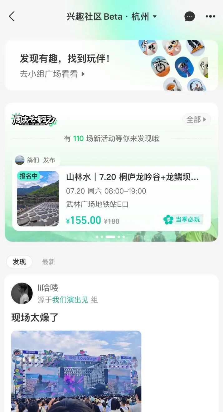 去年8月,支付寶推出“燈火”平臺(tái),正式推進(jìn)流量變現(xiàn)。今年年初,支付寶還內(nèi)測(cè)了一個(gè)名為“興趣社區(qū)”的社交功能(目前只支持杭州),主要為用戶提供基于興趣、熱門活動(dòng)的小組社交,類似豆瓣的同城活動(dòng)。