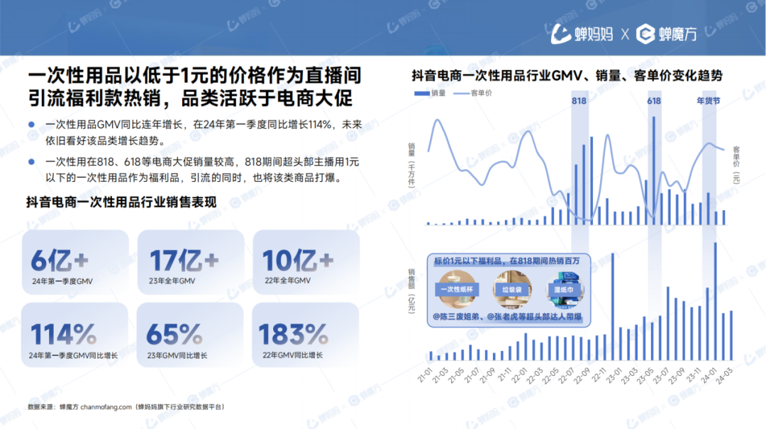 蟬媽媽發(fā)布的《抖音電商一次性用品消費(fèi)趨勢報告》顯示,2024 年一季度一次性用品的 GMV 同比增長了 114%,達(dá)到了 6 億元,對比之下,2023 年全年 GMV 為 17 億元。報告認(rèn)為,一次性用品的火爆與大促期間直播間用一次性用品作為 1 元引流福利商品來增加熱度不無關(guān)系。