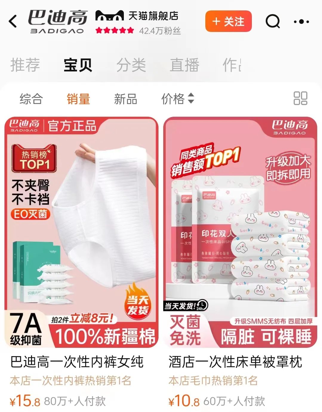 近些年,平臺上還崛起了以巴迪高為代表的一批品牌商家,從戶外和旅行場景切入,專門售賣一次性內(nèi)褲、毛巾、襪子、床上四件套等核心單品,魔鏡洞察數(shù)據(jù)顯示,巴迪高在淘寶/天貓上的季度銷售額自 2023 年以來一直維持在 5000 萬到 1.5 億元之間,已經(jīng)成長為該品類的新勢力商家。