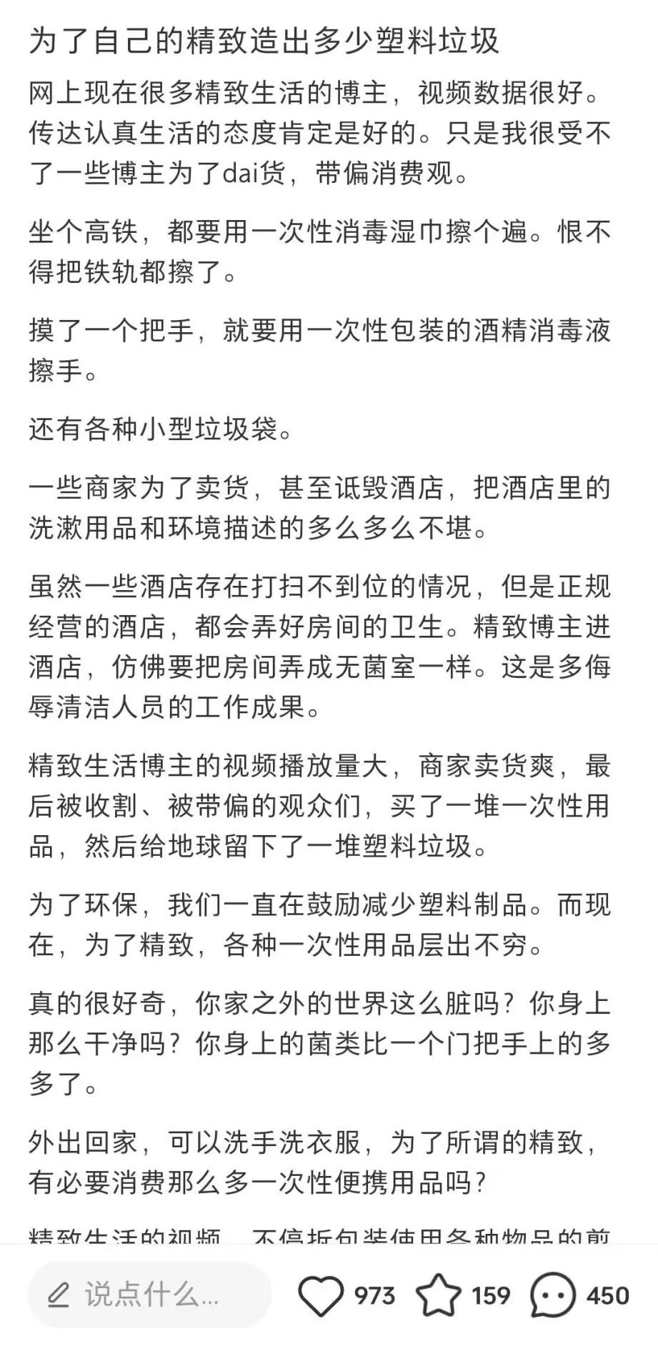 在次拋生活的帖子下方評論區(qū),不斷有人發(fā)問,自己家里一周都不見得打掃一回的人,至于在高鐵上擦擦弄弄幾近瘋魔,有必要為了所謂的精致生活制造出這么多垃圾嗎,還是說僅僅是品牌商家為了賣貨營造的消費(fèi)主義陷阱?
