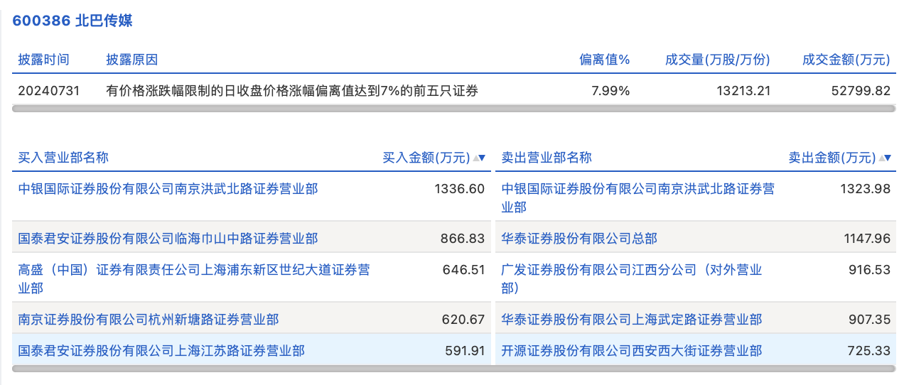 7月31日,北巴傳媒今日漲停,龍虎榜數(shù)據(jù)顯示,上榜營業(yè)部席位全天成交9083.69萬元,占當(dāng)日總成交金額比例為17.2%。其中,買入金額為4062.53萬元,賣出金額為5021.15萬元,合計凈賣出958.62萬元。