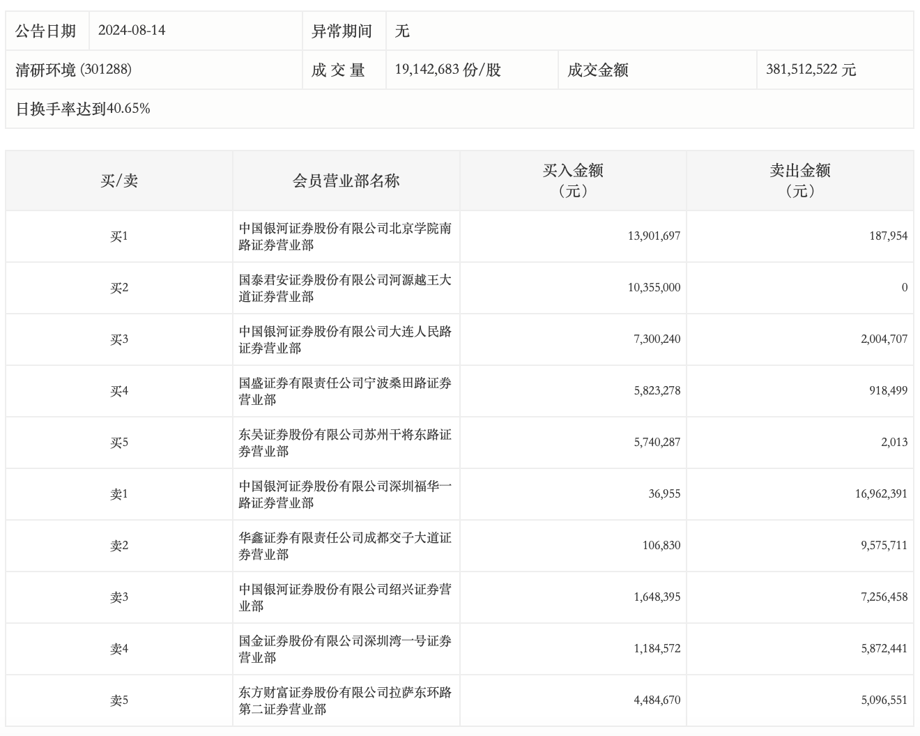 8月14日,清研環(huán)境今日漲10.66%,龍虎榜數(shù)據(jù)顯示,上榜營業(yè)部席位全天成交9845.86萬元,占當日總成交金額比例為25.81%。其中,買入金額為5058.19萬元,賣出金額為4787.67萬元,合計凈買入270.52萬元。