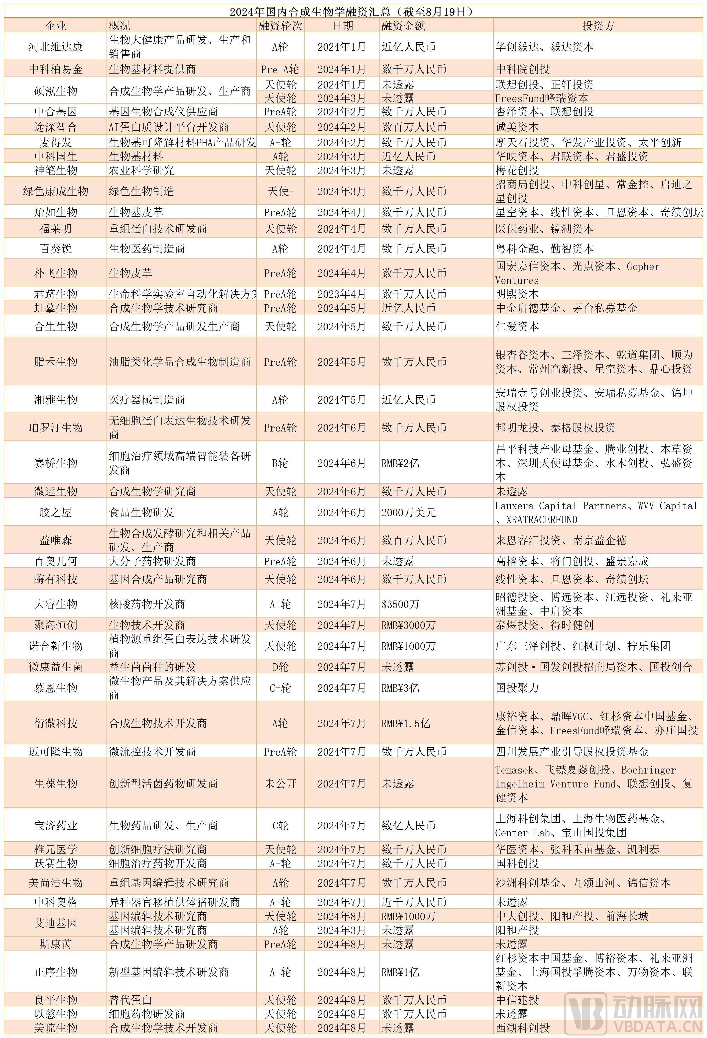 2024年合成生物學(xué)投融資企業(yè)(截至8月19日) 動(dòng)脈網(wǎng)整理