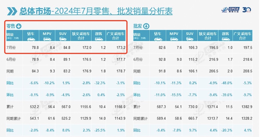 乘聯(lián)會發(fā)布的月銷量數(shù)據(jù)顯示,7月全國乘用車市場總計零售172萬輛,新能源車市場零售87.8萬輛。