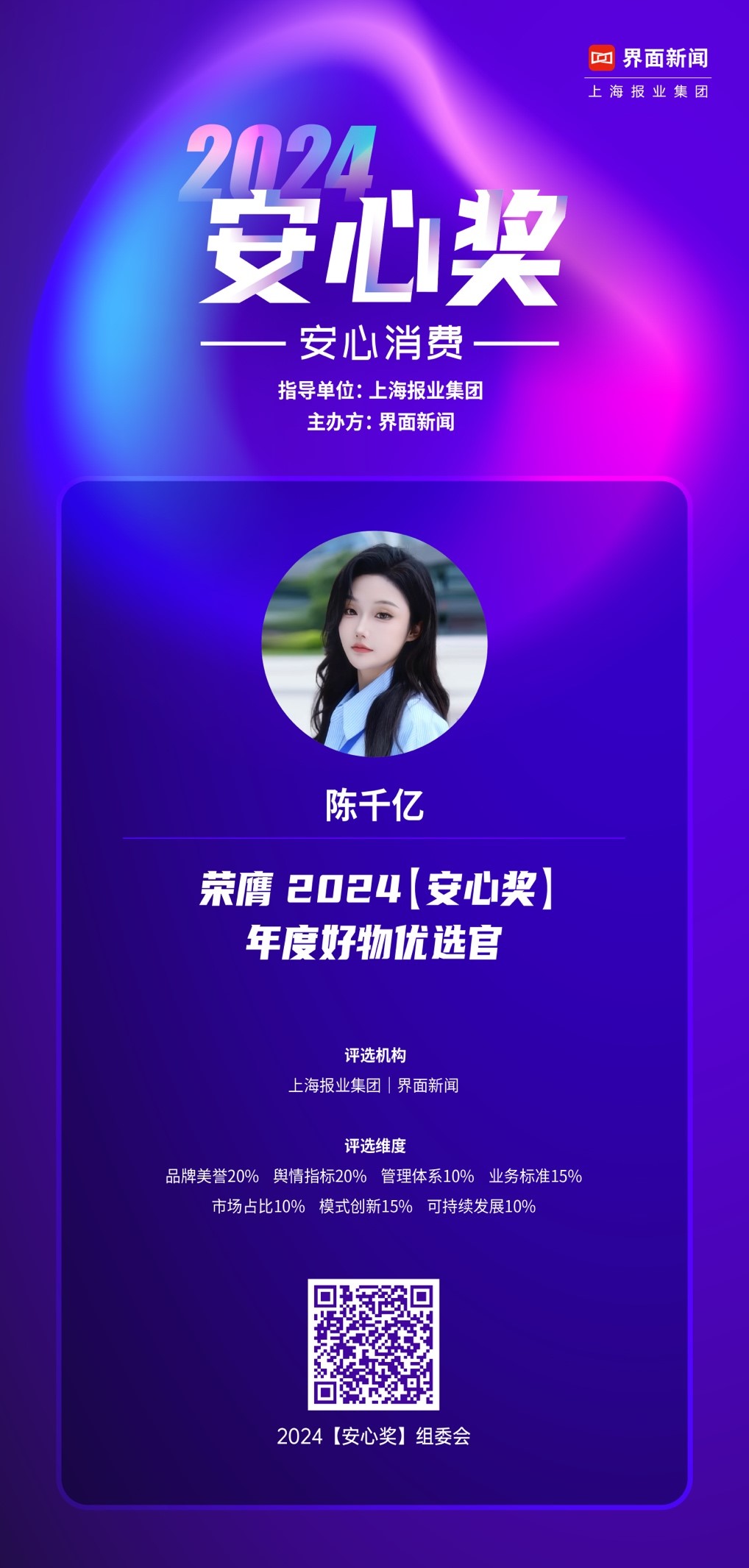 未來(lái)可期,陳千億特此榮獲本屆【新消費(fèi)盛典】【2024安心獎(jiǎng)】年度好物優(yōu)選官。