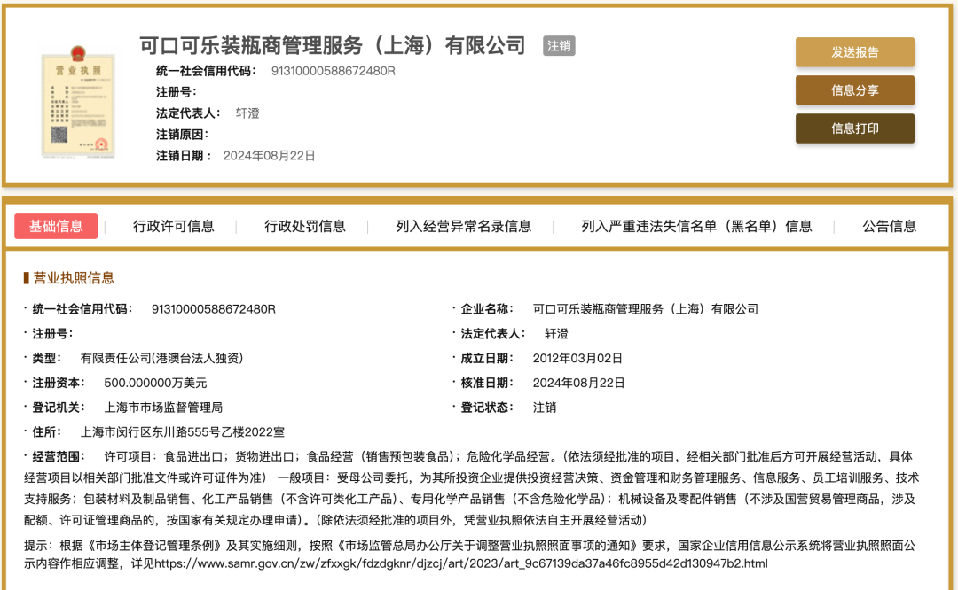 工商信息顯示,8月29日,可口可樂裝瓶商管理服務(wù)(上海)有限公司(下稱:可口可樂裝瓶管理)進(jìn)行清算。在更早的8月22日,該公司狀態(tài)由存續(xù)變更為注銷,原因?yàn)闆Q議解散。該公司由可口可樂旗下Coca-Cola Bottlers Manufacturing Holdings Limited(可口可樂裝瓶商生產(chǎn)控股有限公司,下稱:可口可樂裝瓶控股)100%持股。