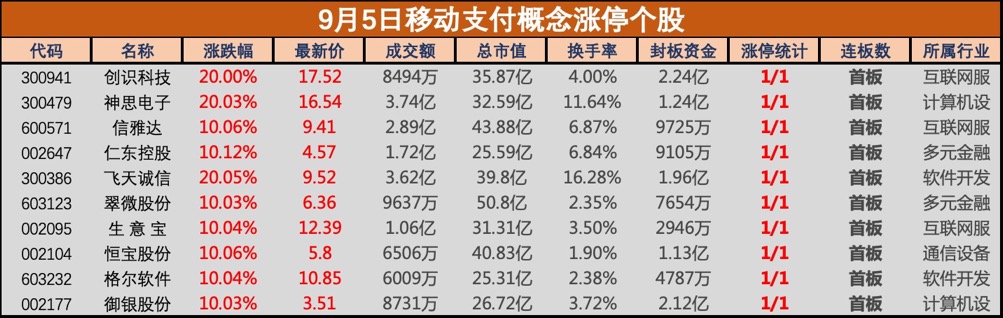9月5日,創(chuàng)識科技(300941)、神思電子(300479)、生意寶(002095)、御銀股份(002177)等10股漲停,世紀恒通(301428)、科藍軟件(300663)、楚天龍(003040)、高偉達(300465)、中科江南(301153)等跟漲。