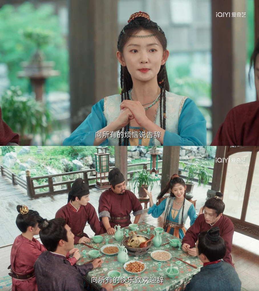 《四方館》已經(jīng)播出的劇情里,有一段是女主阿術(shù)希望大家轉(zhuǎn)變心情,用俗語(yǔ)的口吻說(shuō)出“向所有的煩惱說(shuō)告辭,向所有的快樂(lè)致歡迎辭”這句臺(tái)詞。??炊桃曨l的觀眾立刻就能理解,這句話(huà)是網(wǎng)絡(luò)歌曲《生日祝福歌》里歌詞的變體,原歌詞是“向所有的煩惱說(shuō)拜拜,向所有的煩惱說(shuō)嗨嗨”。