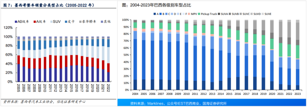 這看起來與海外市場(chǎng)的行情有些出入——拉美、東南亞、中亞等國(guó)內(nèi)汽車重點(diǎn)出口區(qū)域,都是小型車當(dāng)?shù)溃乐钡?023年低端微型和緊湊型轎車占比仍超40%。