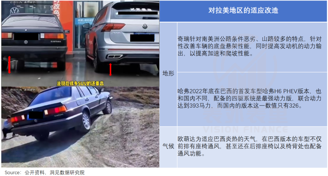 奇瑞瑞虎、上汽名爵等一上來就主推空間更大的SUV,并針對(duì)性提高了動(dòng)力和底盤,一步到位應(yīng)對(duì)拉美的路況——就像40年前國(guó)產(chǎn)桑塔納把轎車的底盤做到逼近SUV的高度一樣。