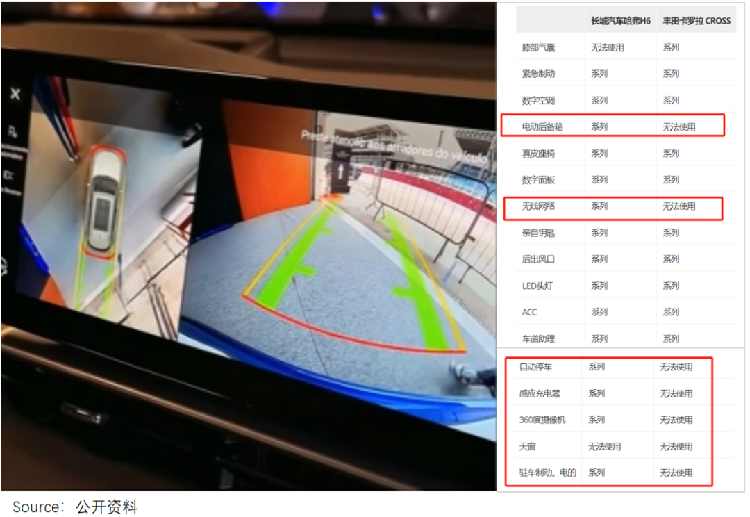 如豐田在巴西推的卡羅拉Cross,價(jià)格和哈弗H6 PHEV看齊,但性能配置顯得遜色:前者的屏幕只有7英寸,且只能聽歌和導(dǎo)航;后者直接10英寸起,能語音控制空調(diào)溫度、天窗和尾門,還能360度無死角顯示周邊障礙以及距離。