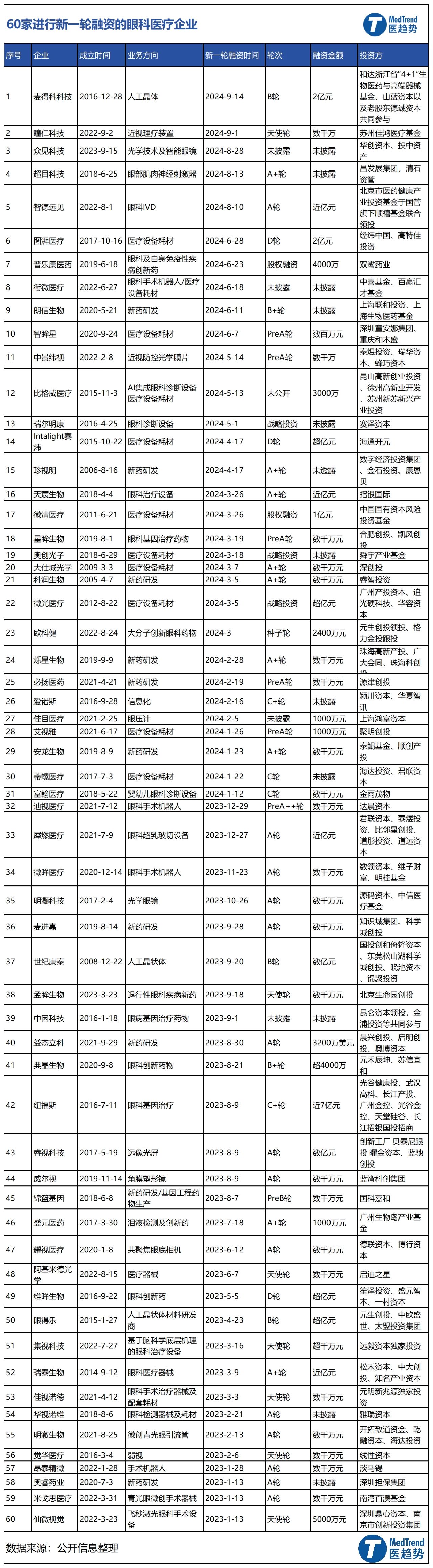 這只是一個小案例。從2023年至今,醫(yī)趨勢對獲得新一輪的融資的中國眼科醫(yī)療企業(yè)進行了一輪梳理,發(fā)現(xiàn)據(jù)不完全統(tǒng)計,自2023年以來,眼科醫(yī)療領域一級市場共有60 起融資事件:獲得融資的企業(yè)包括迪視醫(yī)療、富翰醫(yī)療、Intalight賽煒、微眸醫(yī)療、微清醫(yī)療、犀燃醫(yī)療等一眾創(chuàng)新企業(yè);投資方則是云集了淡馬錫、深創(chuàng)投、元生創(chuàng)投、招銀國際等明星企業(yè)和投資機構。