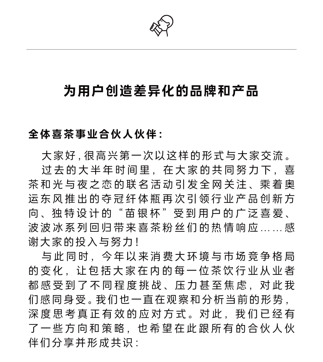 9月18日,喜茶在內(nèi)部信中表示“門店規(guī)模并不是茶飲行業(yè)的關(guān)鍵”,承諾不走同質(zhì)化路線,不打價(jià)格戰(zhàn),致力于提供獨(dú)特的品牌體驗(yàn)和產(chǎn)品差異化,接下來幾個(gè)月將嚴(yán)格把控開店速度和數(shù)量。
