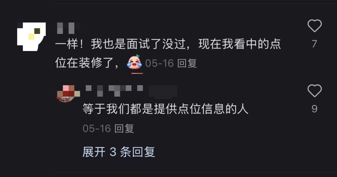 一位來自浙江的用戶分享了他的經(jīng)歷,“面試的時(shí)候問我那個(gè)點(diǎn)位能不能拿下,我說絕對(duì)沒問題,結(jié)果通過后告訴我那個(gè)點(diǎn)位他們要自己安排,打死都不讓我做”,不少人在評(píng)論區(qū)附和,“很多品牌都是這樣,看好了點(diǎn)位打電話咨詢被套了話,然后沒過多久看到已經(jīng)在裝修”,這些優(yōu)質(zhì)的位置最后常常變成了公司內(nèi)部的資源。