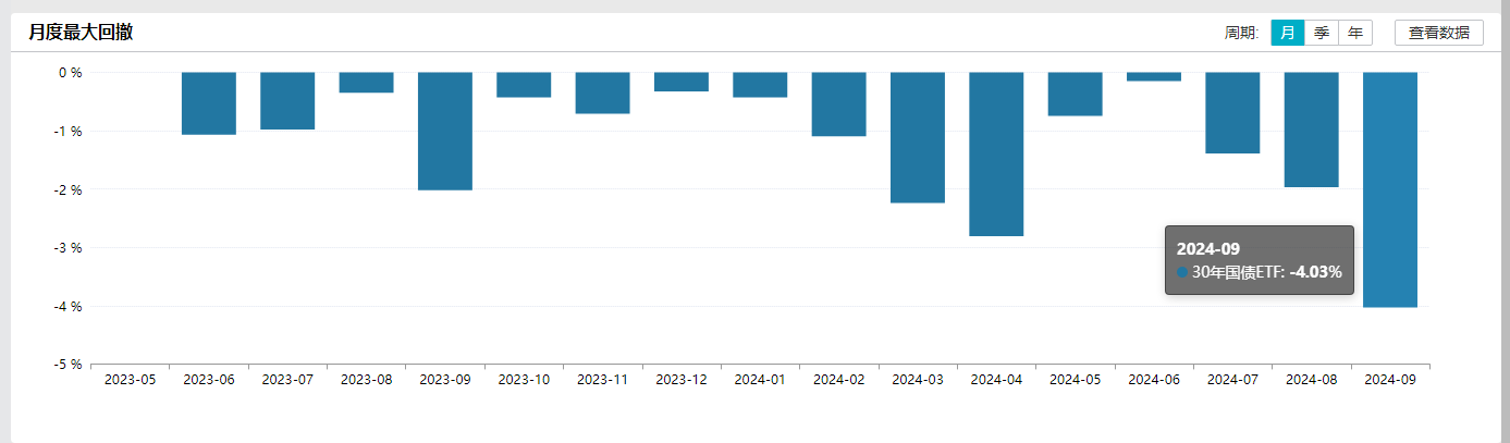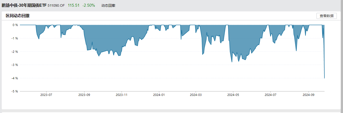 同樣,2只超長(zhǎng)期國(guó)債ETF也創(chuàng)上市以來(lái)最大跌幅,單日雙雙重挫逾2%。當(dāng)天,鵬揚(yáng)中債-30年期國(guó)債ETF跌2.87%,博時(shí)上證30年期國(guó)債ETF收跌2.34%,均創(chuàng)上市以來(lái)最大單日跌幅。Wind統(tǒng)計(jì)顯示,截至2024年9月27日,在全周5個(gè)交易日里,居首的鵬揚(yáng)中債-30年期國(guó)債ETF周內(nèi)跌幅高達(dá)3.81%,博時(shí)上證30年期國(guó)債ETF以3.44%的周跌幅緊隨其后。