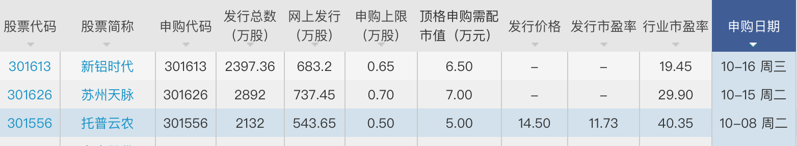 其中10月15日,打新者可申購蘇州天脈(301626.SZ),10月16日可申購新鋁時代(301613.SZ),兩者均為創(chuàng)業(yè)板公司,兩者申購上限分別為0.7萬股和0.65萬元,發(fā)行價格暫未更新。