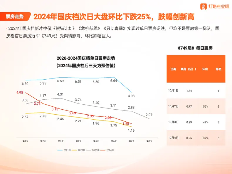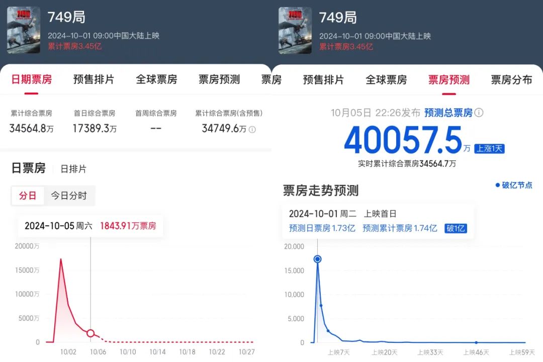 票房也隨著口碑迎來了全面崩塌?!?49局》從首日的單日票房1.7億,迅速跳水至10月5日的1840萬。平臺(tái)首日給出的票房預(yù)測(cè)為9.31億,目前也已降至4億。