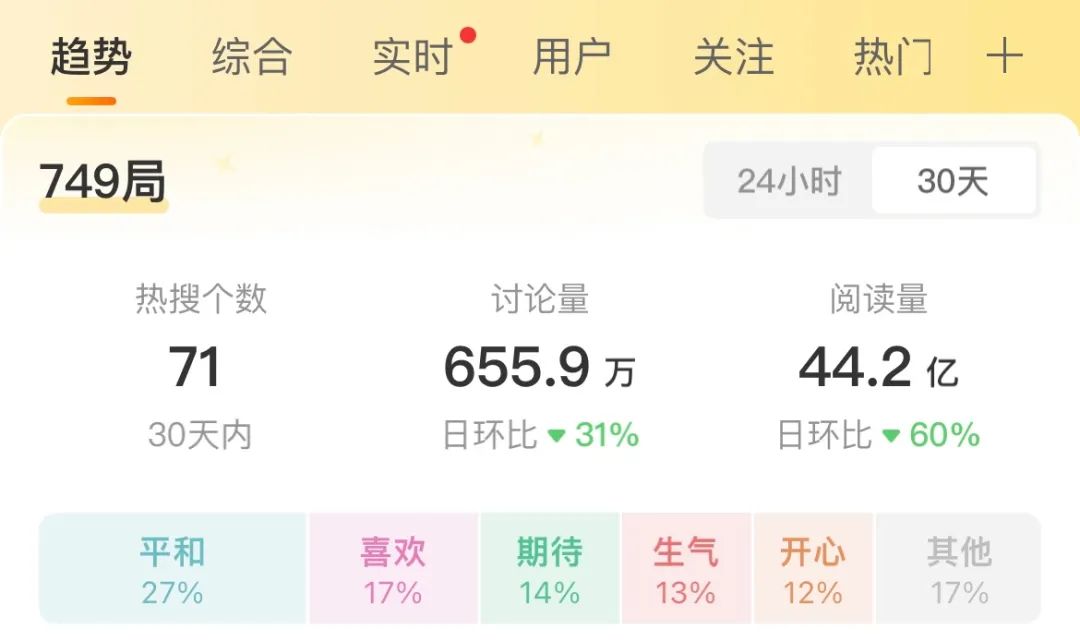 出現(xiàn)這樣的落差,說明觀眾映前對(duì)國慶檔的影片期待值不低,但后續(xù)興致逐漸散去?!笆甲髻刚摺币埠糁觥p平臺(tái)想看指數(shù)最高、預(yù)售最高、預(yù)測(cè)票房滑落最大的《749局》。