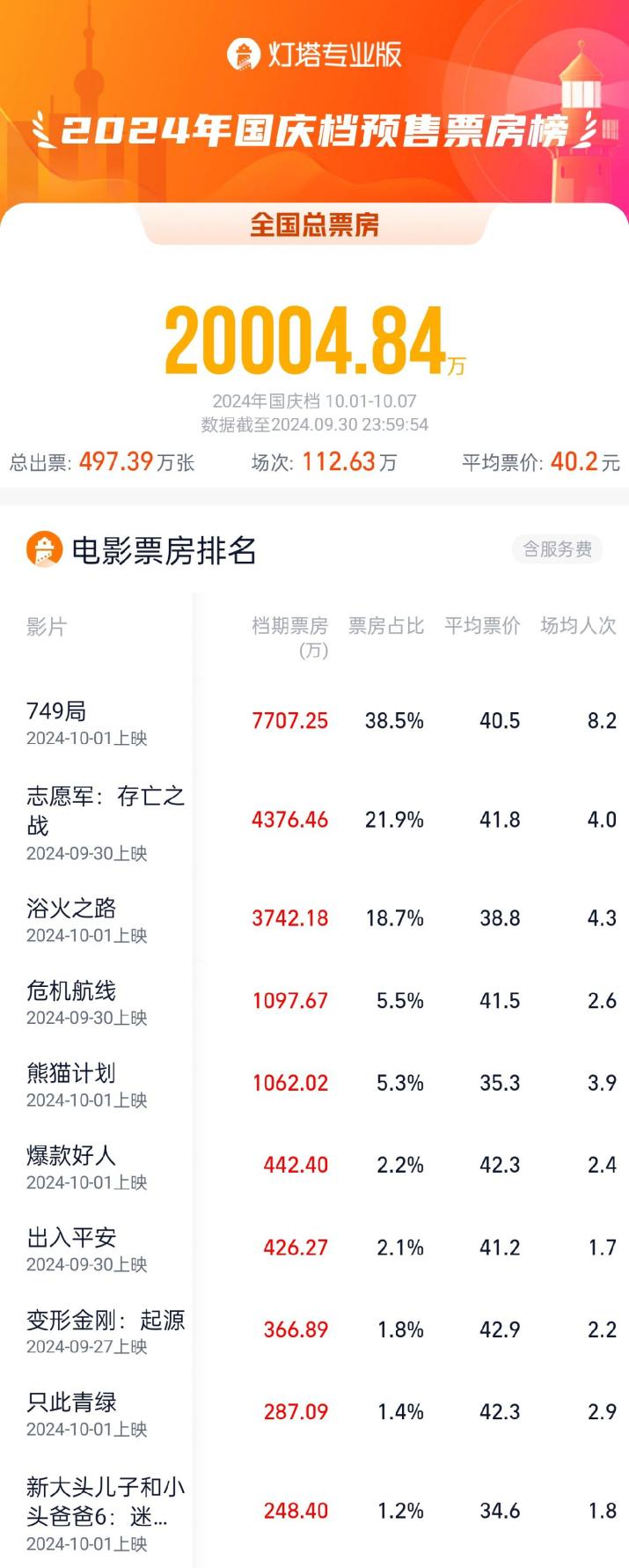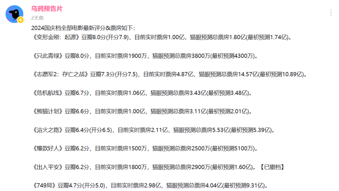 可惜的是,除了《749局》之外,國慶檔余下的影片未能掀起全民討論的話題,這也讓“黑馬”沒能如期出現(xiàn)。