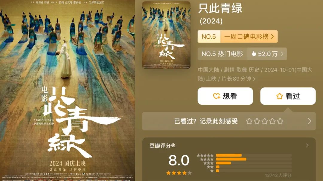 倒是國慶檔評(píng)分最高的舞劇電影《只此青綠》,雖很難在票房上掀起過大的水花,但至少對(duì)于豐富影院供給而言有積極意義。去年以來,國內(nèi)觀眾可以在電影院看到演唱會(huì)、奧運(yùn)比賽,如今又可以看到舞劇,影院內(nèi)容供給的多樣化已成為明確趨勢(shì),從更長遠(yuǎn)的眼光來看有利于幫助影院培養(yǎng)更多增量觀眾。再加上,雖然話劇電影或戲曲電影此前也常有出現(xiàn),但大多數(shù)時(shí)候上映于冷檔期,《只此青綠》于大檔期上映,更能幫助類似于舞劇電影的新形式被新觀眾所認(rèn)知、所接受。