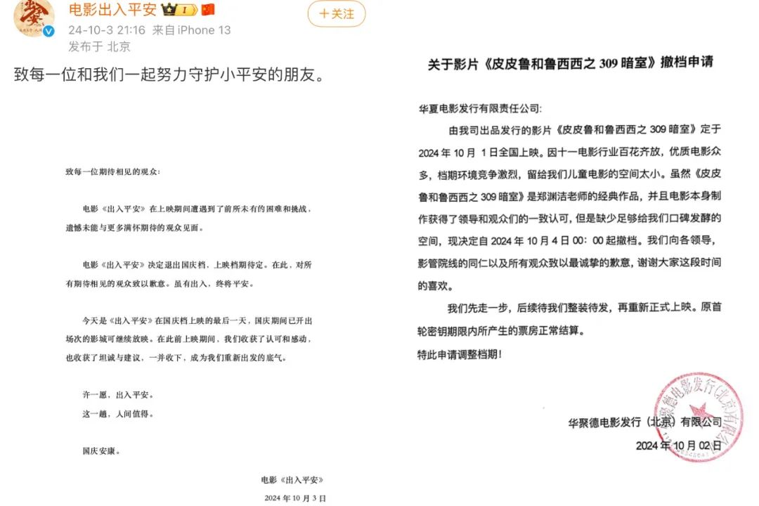 今年國慶檔撤檔了《出入平安》和《皮皮魯和魯西西之309暗室》兩部影片,算上這兩部,今年國慶檔上映的新片多達(dá)10部。